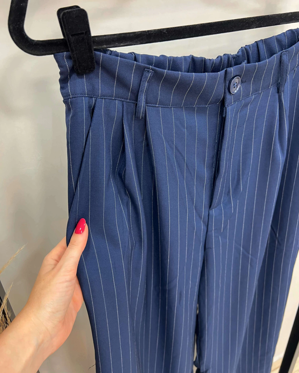 Aposte na sofisticação atemporal da calça de alfaiataria com risca de giz! Com modelagem reta e cintura alta, essa peça traz elegância e conforto em equilíbrio perfeito. Possui bolsos laterais, elastico imperceptivel na parte de trás e fechamento com botão e zíper, além de passantes para cinto que valorizam a cintura. Ideal para composições formais ou para um look casual chic com tênis.
