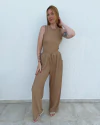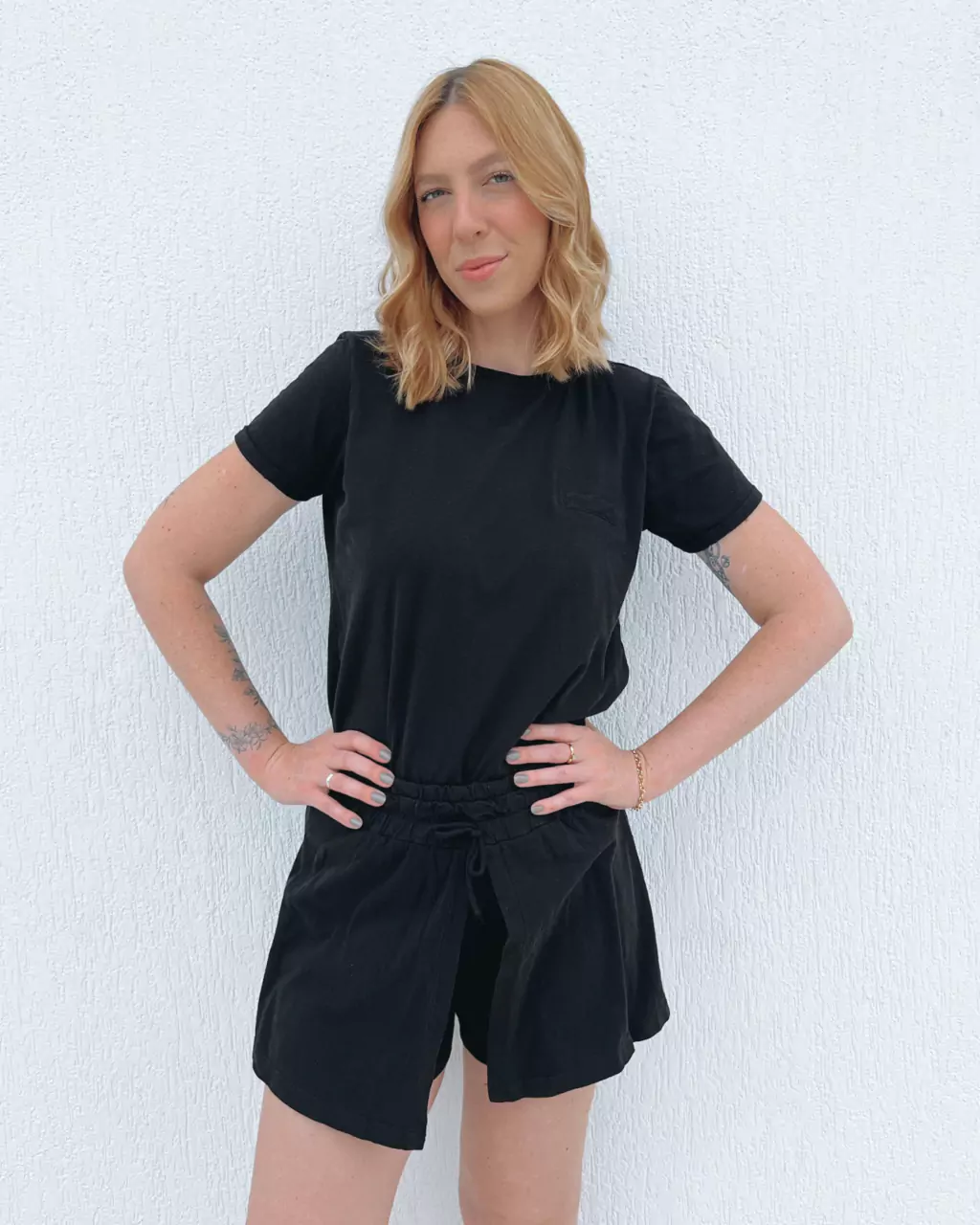 Conjunto com o short/saia mais diferente que você já viu. Atrás é saia e na frente aparece a saia e o short, com isso da um movimento incrivel quando caminha. Conjunto super confortável e leve para usar no calor. Short com elastico na cintura e camiseta soltinha, pode ser usada com cima ou por dentro do short/saia.
