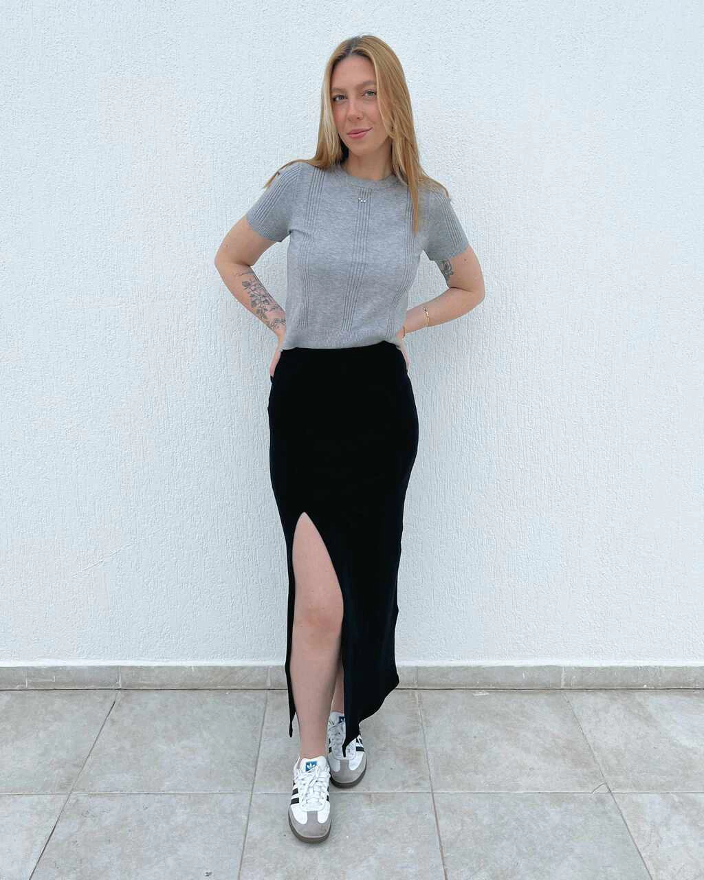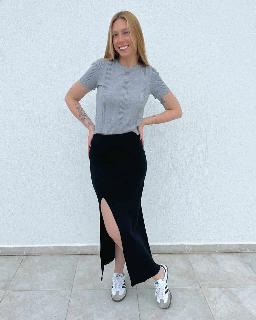 Detalhes: Cós com elástico, fenda lateral, comprimento midi